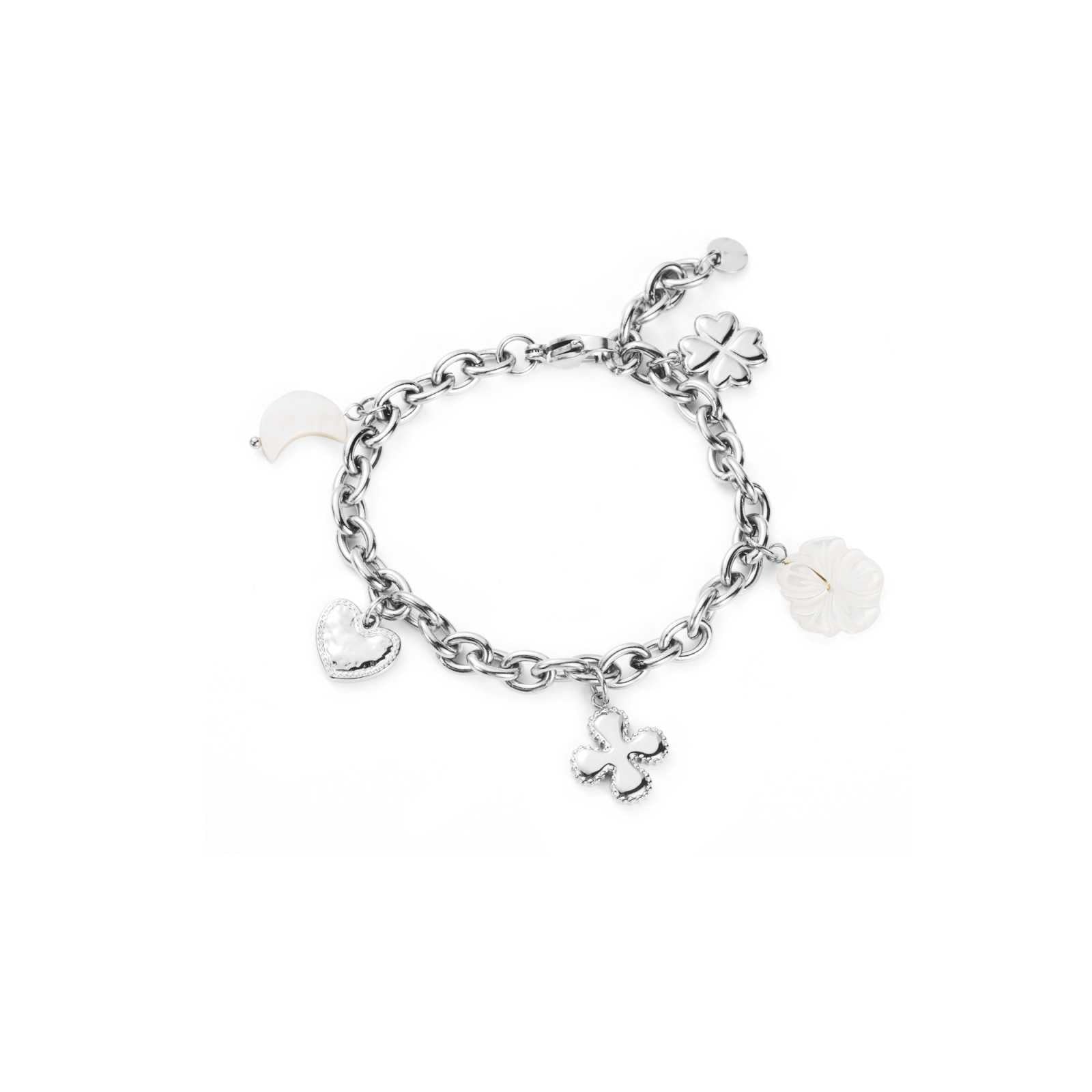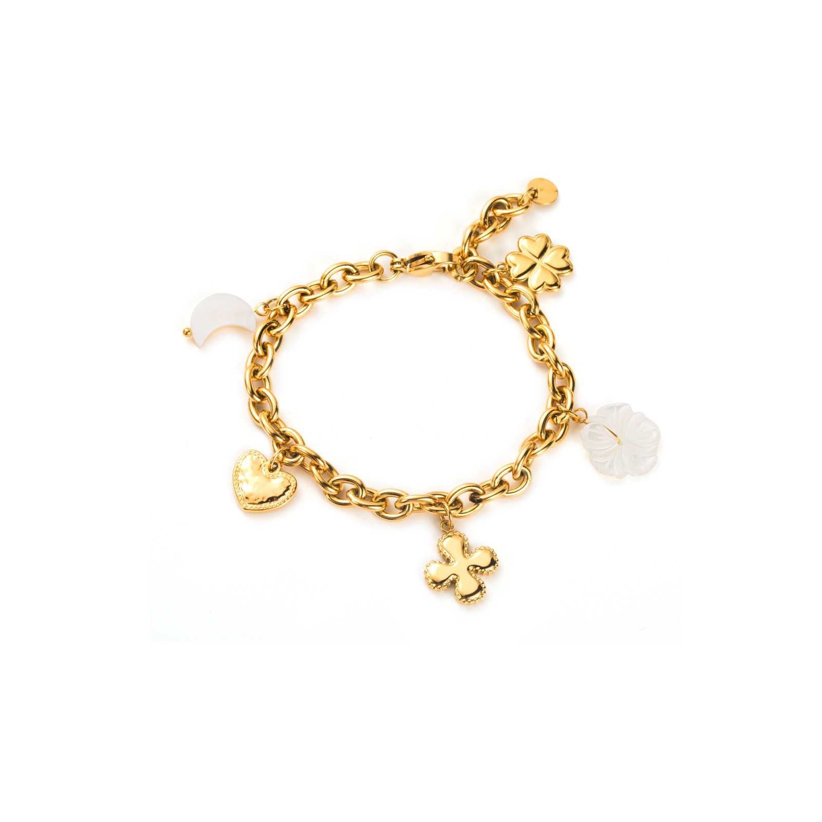 Élégant et poétique, ce bracelet de couleur argenté se pare de charms aux symboles doux : cœur, trèfle, fleur et lune. Idéal pour un look raffiné ou romantique.