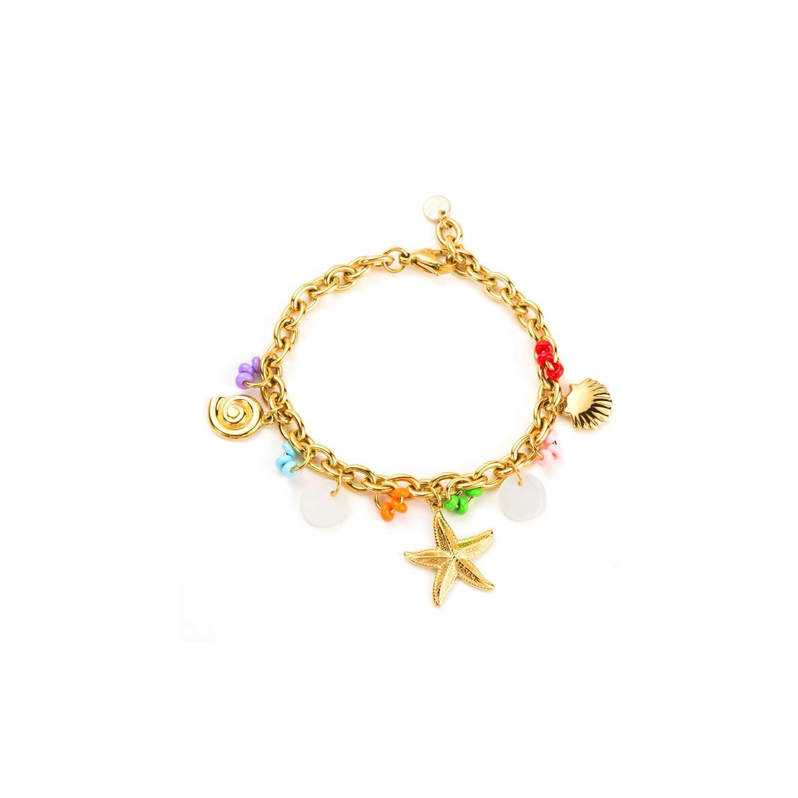 Un bijou joyeux et coloré inspiré des trésors de l’océan. Ce bracelet chaîne dorée s’illumine de breloques multicolores en forme d’étoile de mer, de coquillage et de perles fantaisie. Parfait pour une touche estivale à votre tenue.
