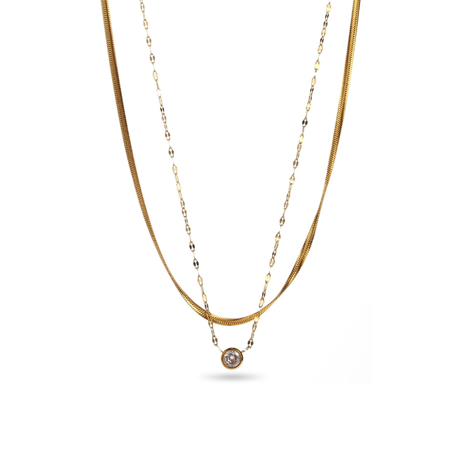 Combinant finesse et éclat, le collier ALICIA se compose d'une délicate chaîne à maillons entrelacés, rehaussée d’un pendentif rond serti d’un strass brillant, accompagnée d'une élégante chaîne serpent dorée pour un effet superposé tendance et chic.Collier double rang avec strass