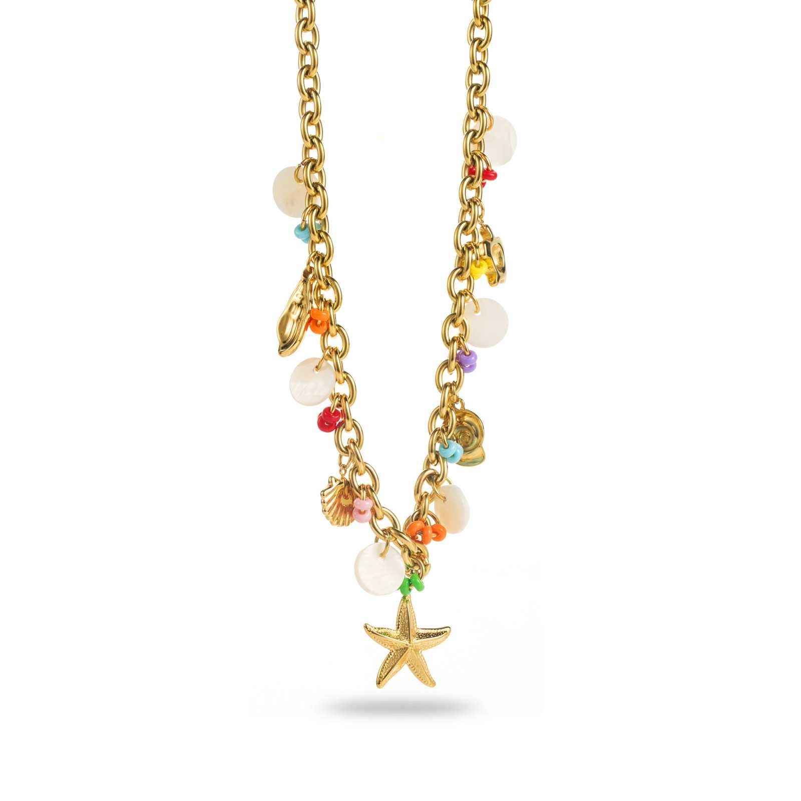 Un bijou joyeux et coloré inspiré des trésors de l’océan. Ce collier chaîne dorée s’illumine de breloques multicolores en forme d’étoile de mer, de coquillage et de perles fantaisie. Parfait pour une touche estivale à votre tenue.